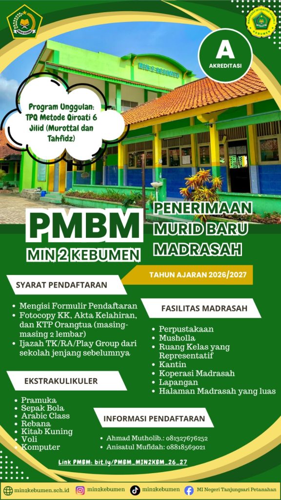 MIN 2 Kebumen adalah Sekolah Islam terdepan di Kebumen dengan Akreditasi A. Kami berkomitmen penuh Mendidik Generasi Saleh dan Berprestasi dengan bekal ilmu dunia dan akhirat.